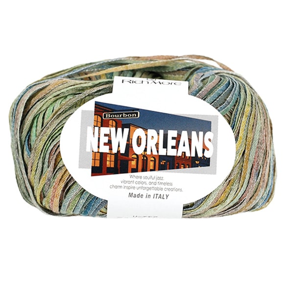 アクセントカラー2色を撚糸しながらベースカラーのリリヤーンで包んだ3色のレーヨン糸で構成されたファンシーヤーンです。